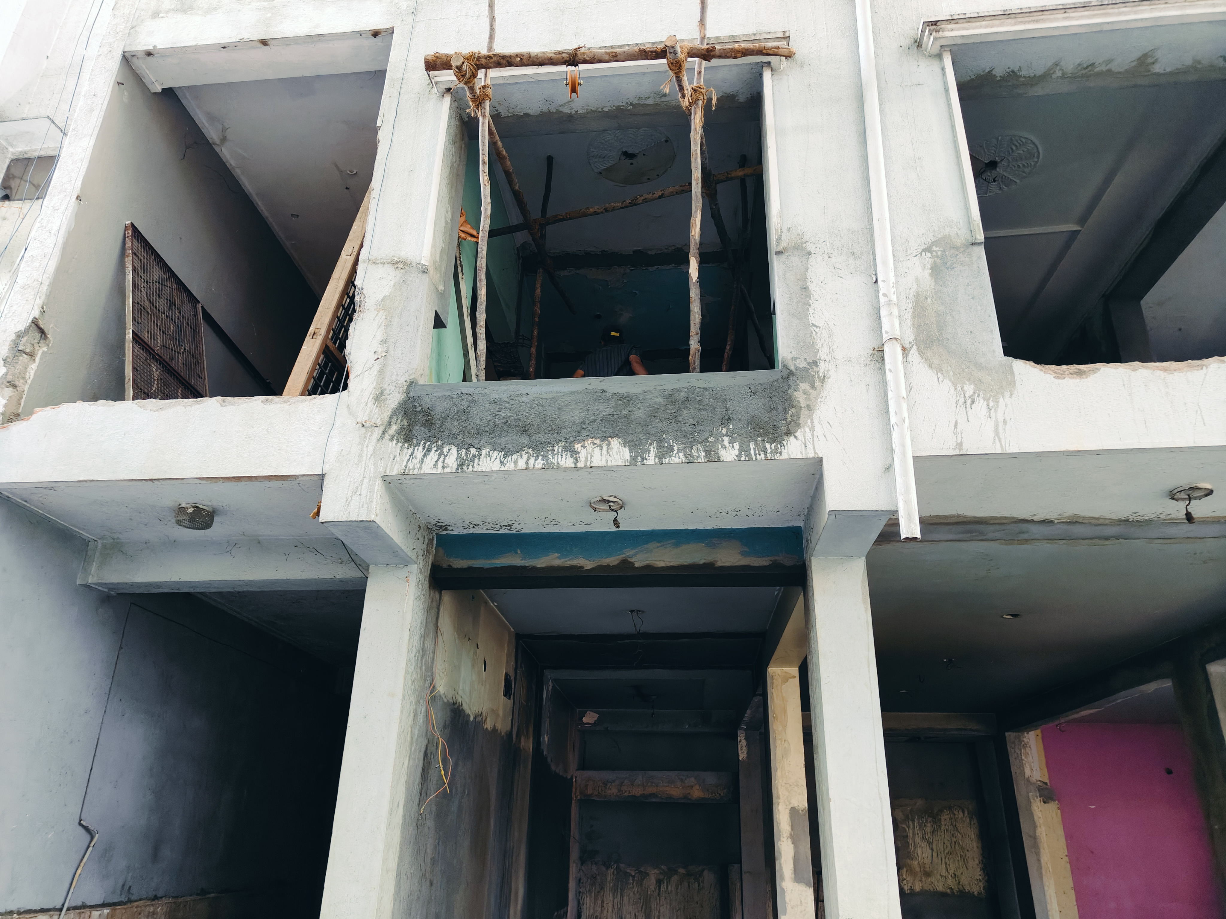 The project involved rectifying a critical structural irregularity where the load distribution was inconsistent—12 columns at ground floor, reduced to 7 columns at first floor, and again increased to 12 columns at second floor. This mismatch posed a serious stability risk. Additionally, the building was attached to adjacent properties, resulting in water seepage and demanding extreme care to avoid damage to neighbouring structures during correction.
